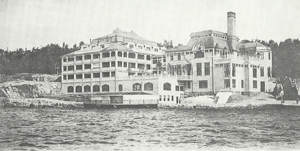 - att Vaxholm blev badort i slutet på 1800-talet. Att bada kallbad blev mycket populärt under senare delen av 1800-talet och G.L. Högberg som ägde Källviken på sydvästra Rindö uppförde en hotell- och restaurngbyggnad, gymnastikhall och ett par villor som fick namnet RIndöbaden. En ångslup inköptes för trafik mellan staden och ön. Verksamheten blomstrade och gästerna njöt av den friska luften, promenaderna i barrskogen, färderna på sjön och det "jernrika" vattnet i fyra vattenkällor med brunnshus. Rindön blev militärläger 1902 och kuranstalten gick i konkurs. Den stora huvudbyggnaden brann 1908.